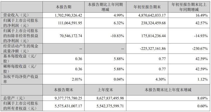 首先,营收以及利润方面,今年前三季度,寒锐钴业营收为48.71亿元,同比增长16.49%;净利润为2.38亿元,同比增长42.57%;扣非净利润为1.76亿元,同比下滑14.93%。