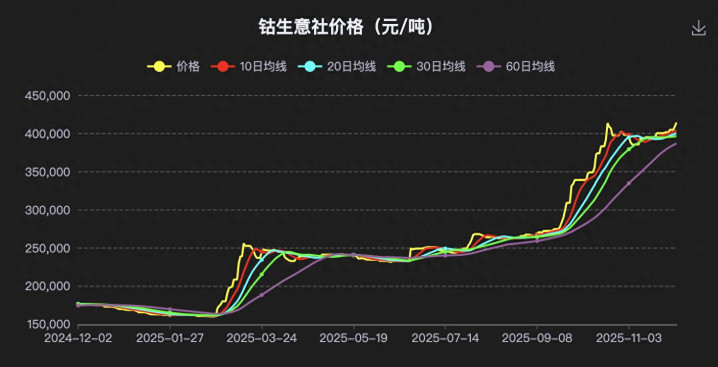 根据生意社价格显示,从年初至今钴价从16万元/吨左右暴涨至最新的41万元/吨左右,价格已经翻倍。